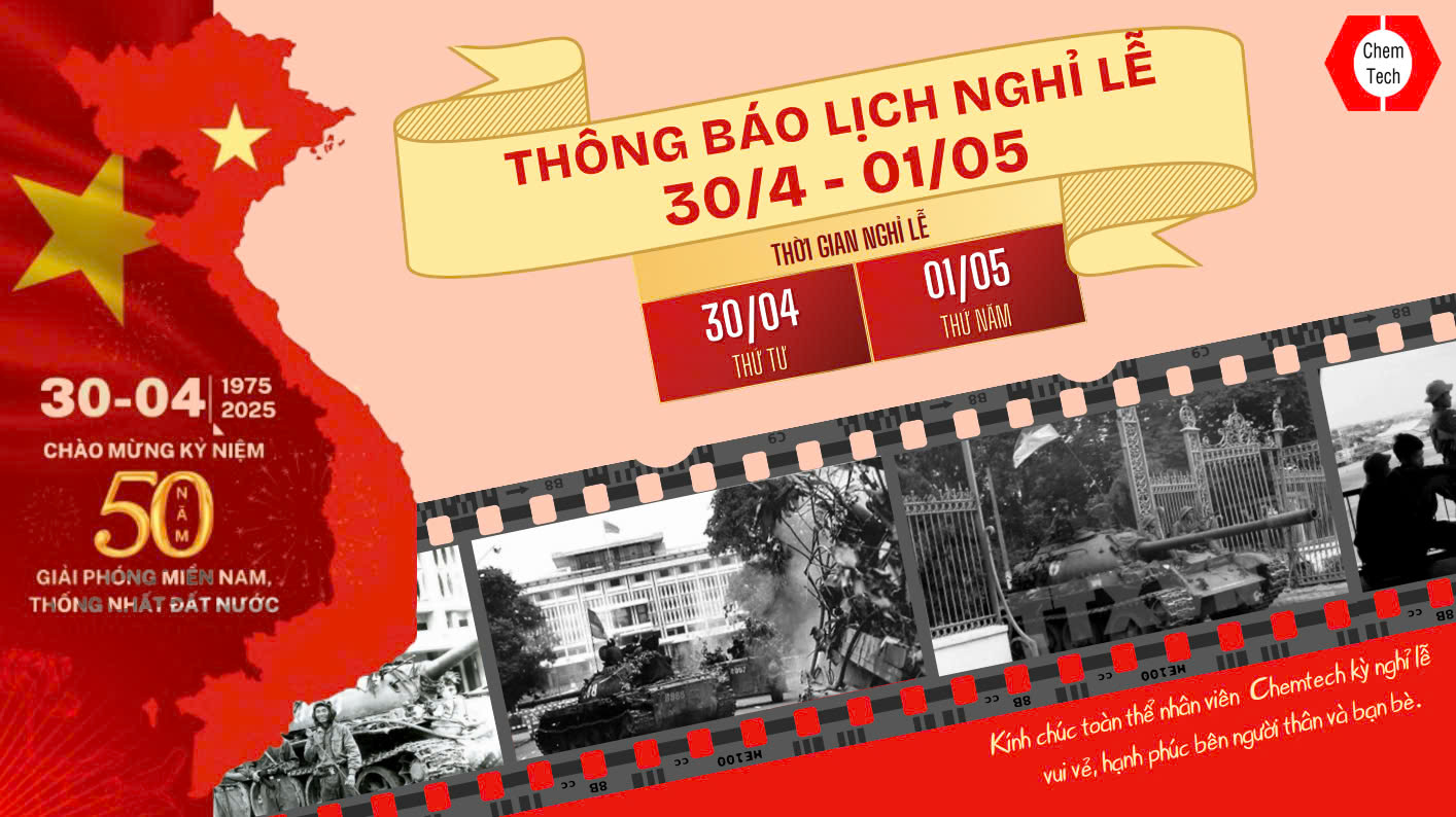 Công ty TNHH Chemtech xin trân trọng thông báo lịch nghỉ lễ ngày giải phóng Miền Nam và Quốc Tế Lao Động 30/4 – 1/5 đến toàn thể quý khách hàng như sau: